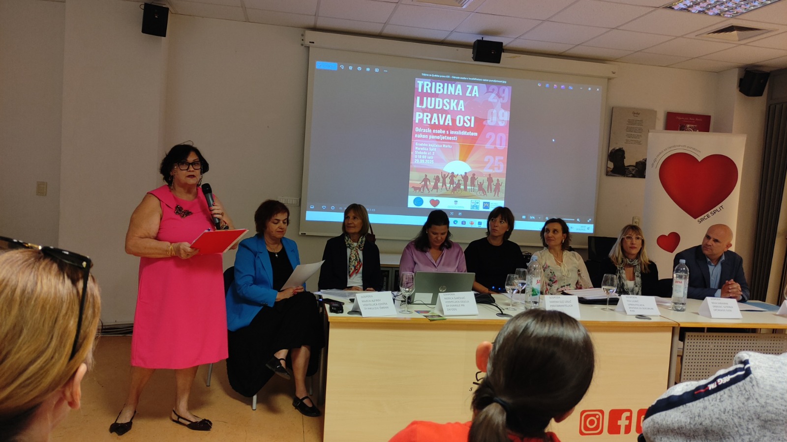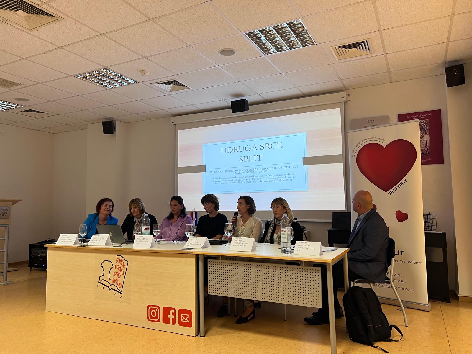 Nakon uvodne riječi podrške ovakvim aktivnostima pročelnika Upravnog odjela za društvene djelatnosti Mate Omazića i pozdravnog govora predsjednice Udruge Srce Split, Dajane Škrobice, svoja su znanja i iskustva redom izložili Pravobranitelj OSI Dario Jurišić, Tea Ljubić – upraviteljica Zavoda za socijalni rad – područni ured Split, Maja Karaman Grbavac, sutkinja Općinskog suda, Marina Elez Urlić – ured Pravobranitelja OSI – područni ured Split, Merica Šarčević pri Zavodu za socijalni rad – područni ured Split – Odjel za odrasle osobe s invaliditetom i Marija Alfirev – ravnateljica Centra za socijalnu inkluziju Šibenik. Tribini nije mogla prisustvovati Sandra Pavela – voditeljica Odjela za posebno skrbništvo pa je sastanak s njom najavljen već u idućim tjednima. Tribinu je moderirala Snježana Ćatović, dopredsjednica Udruge Srce Split.